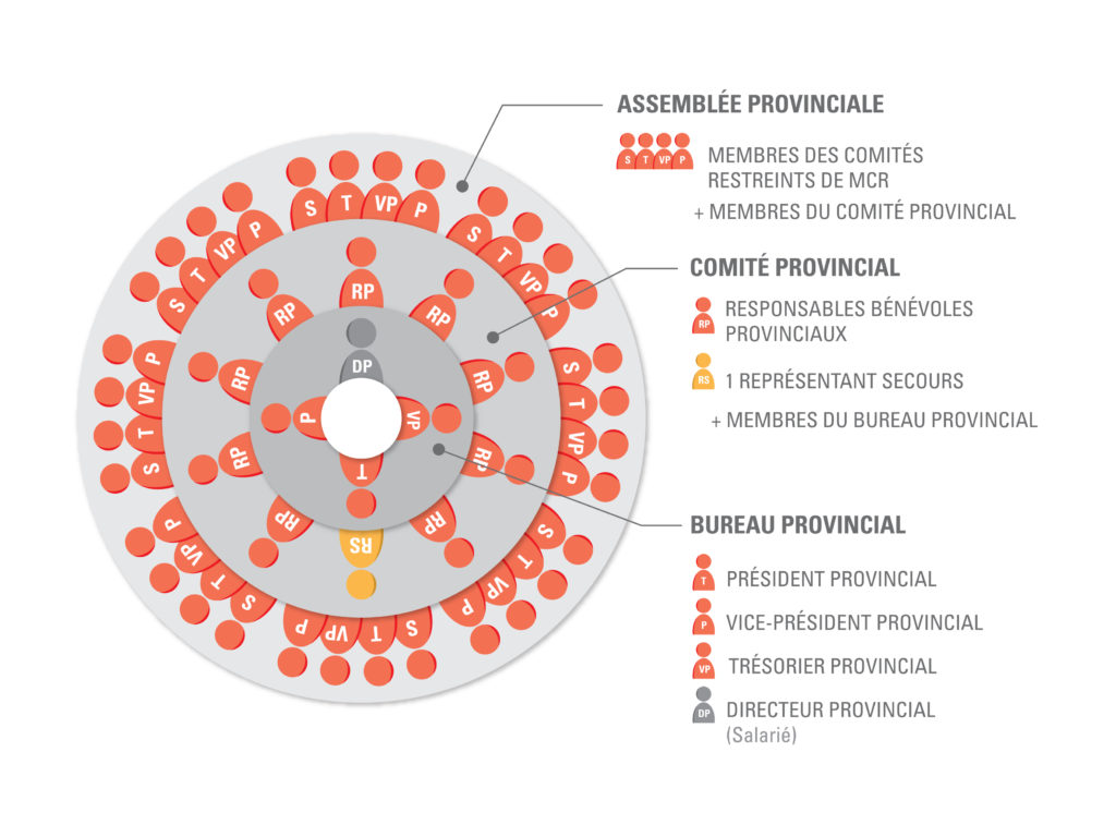 Avec les responsables bénévoles provinciaux·ales et le·a représentant·e des secours, le bureau provincial constitue le comité provincial dont le rôle est de déterminer les actions et projets à mener sur le territoire de la province, d’en évaluer la pertinence et la mise en oeuvre ainsi que de participer à la préparation du budget provincial annuel. Par ailleurs, les coordinateur·trices salarié·es provinciaux ·ales et des volontaires ou expert·es peuvent être invité·es à participer aux réunions avec voix consultative.